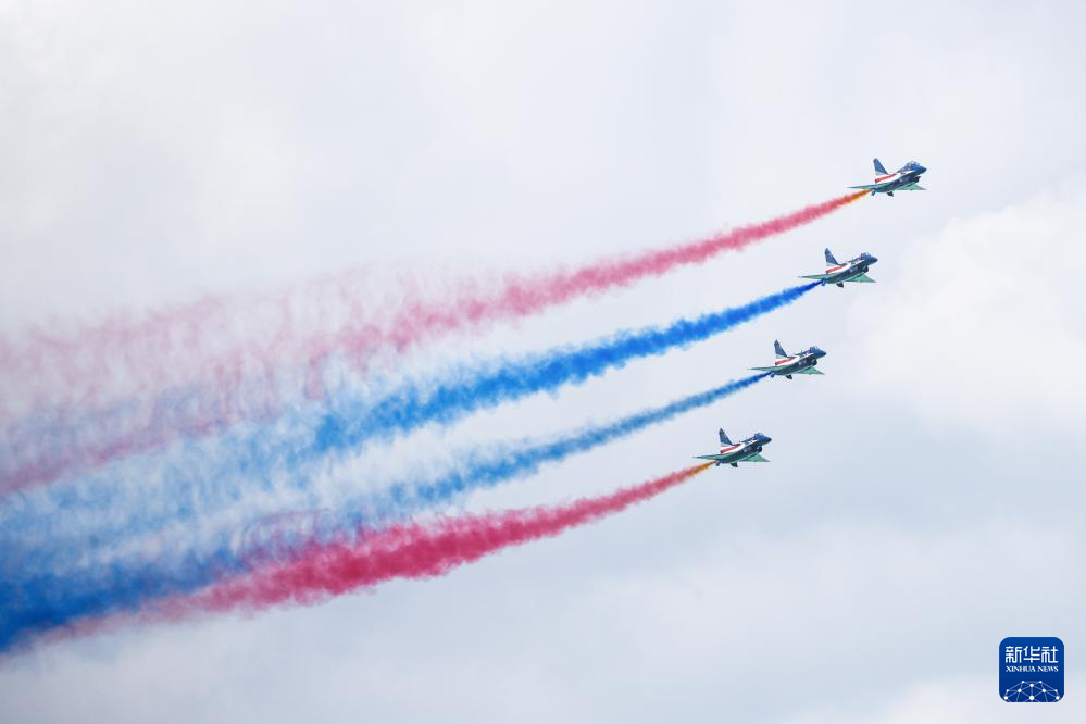 13时许,在云底高900米的气象条件下,中国空军八一飞行表演队精彩亮相。喷涂中国国旗和“八一”军徽的表演机抵达新加坡樟宜展览中心,率先编成超密集六机大箭队,在海面上空拉出红、黄、蓝3种颜色6道彩烟,以低空通场形式向各国来宾致以问候。