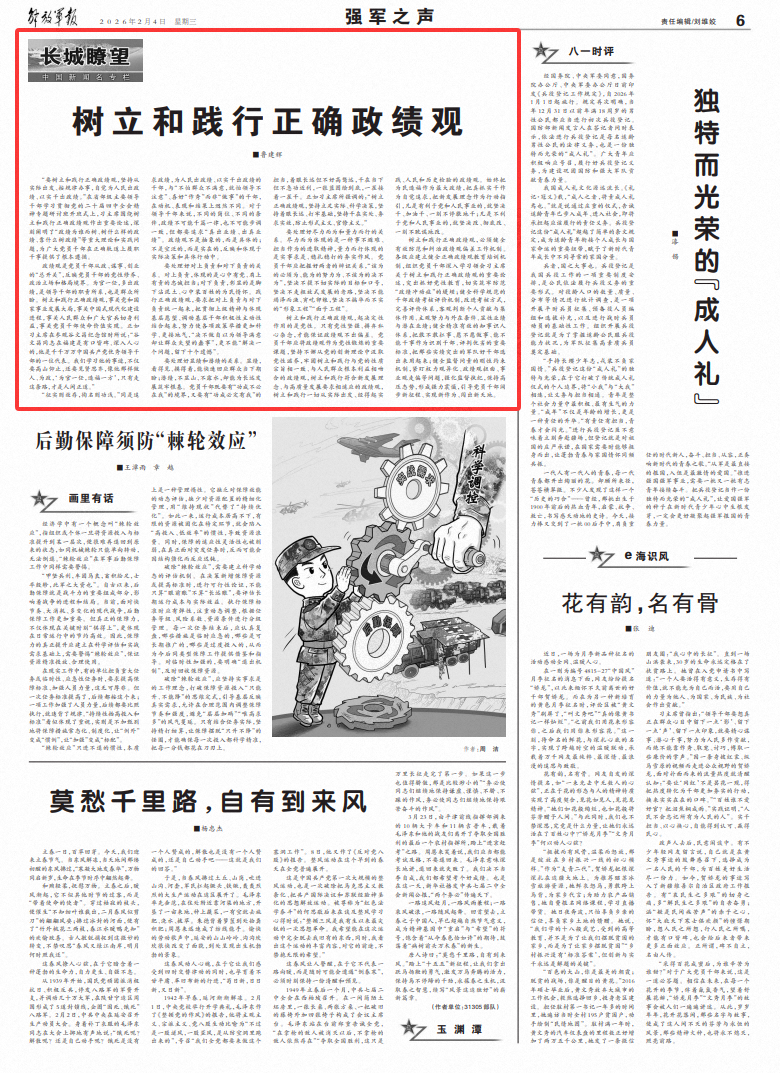 树立和践行正确政绩观,必须健全有效防范和纠治政绩观偏差工作机制。各级应建立健全正确政绩观教育培训机制,组织党员干部深入学习领会习主席关于树立和践行正确政绩观的重要论述,突出抓好党性教育,切实筑牢防范“政绩冲动症”的堤坝;健全科学规范的干部政绩考核评价机制,改进考核方式,完善评价体系,客观判断个人贡献与集体作用、主观努力与外在条件、显性业绩与潜在业绩;健全精准有效的知事识人体系,把敢不敢扛事、愿不愿做事、能不能干事作为识别干部、评判优劣的重要标准,把那些实绩突出的军队好干部选出来用起来;健全监督问责的刚性约束机制,紧盯权力观异化、政绩观扭曲、事业观走偏等问题,强化监督执纪,保持高压态势,形成强力震慑,引导党员干部阔步新征程、实现新作为、闯出新天地。