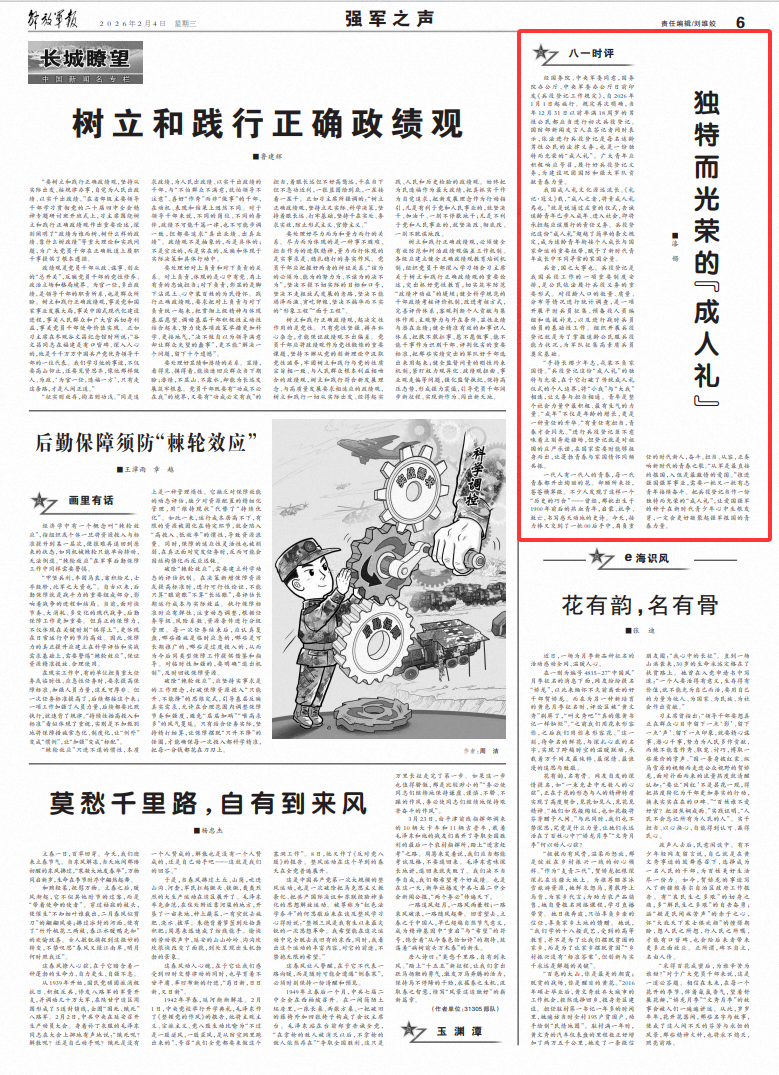 “手持长缨少年志,戎装不负家国情。”兵役登记这份“成人礼”的独特与光荣,在于它打破了传统成人礼仪式的个人边界,将“小我”与“大我”相连,让义务与担当相通。青年是整个社会力量中最积极、最有生气的力量。“成年”不仅是年龄的增长,更是一种责任的升华。“有责任有担当,青春才会闪光。”进行兵役登记虽不意味着立刻奔赴疆场,但登记就是对祖国的庄严承诺,在国家需要时能够挺身而出,让蓬勃青春与家国情怀同频共振。
