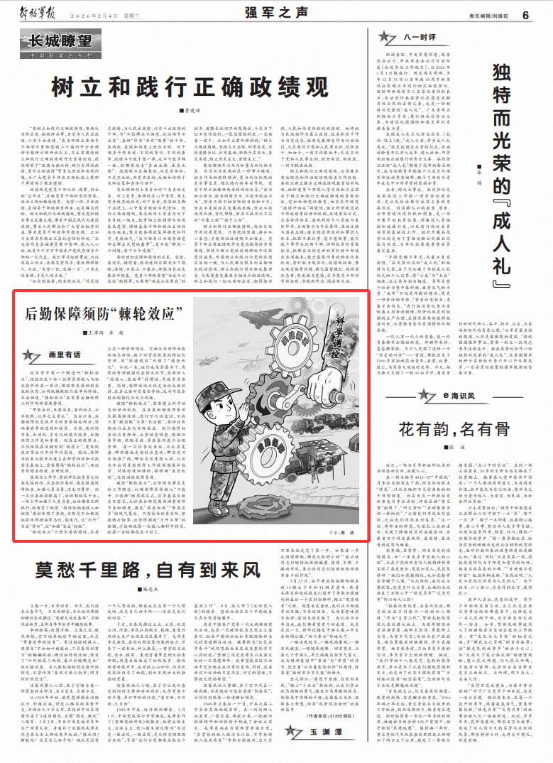 “甲坚兵利,车固马良,畜积给足,士卒殷轸,此军之大资也”。自古以来,后勤保障就是战斗力的重要组成部分,影响着战争的进程和结局。当前,面对快节奏、大消耗、多变化的现代战争,后勤保障工作更加重要。但真正的保障力,不仅体现在关键时刻“供得上”,更体现在日常运行中的节约高效。因此,保障力的真正提升应建立在科学评估和实战需求基础上,需要警惕“棘轮效应”,保证资源精准投放、合理使用。