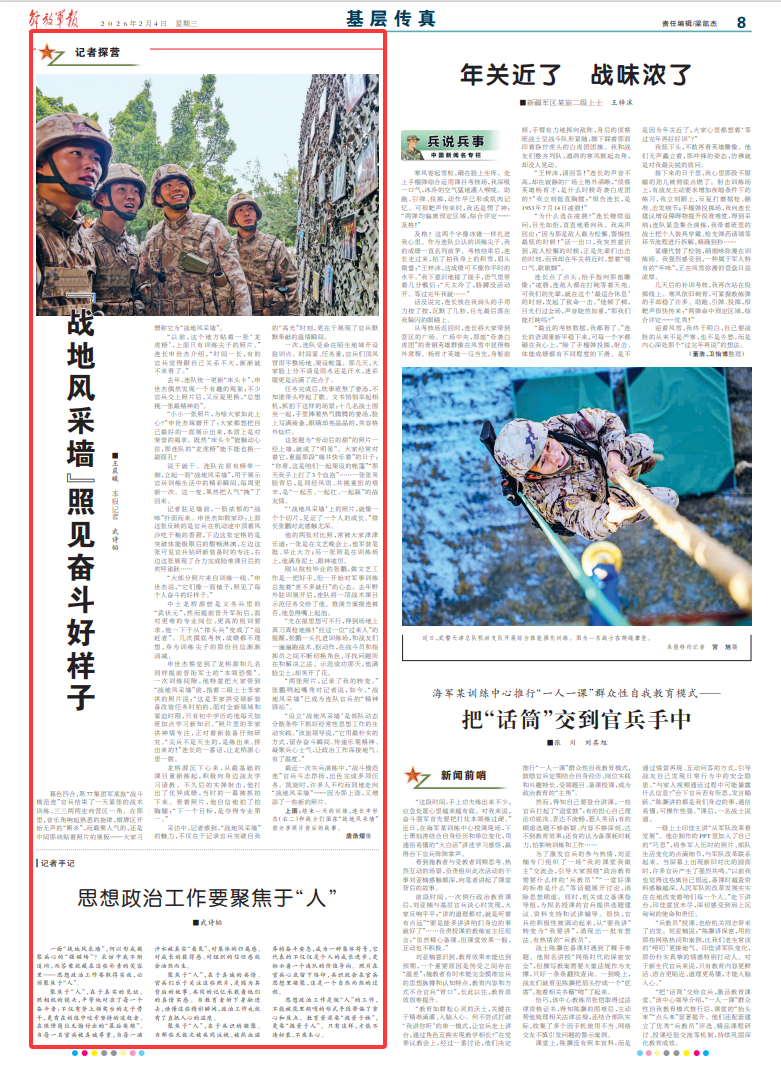 “设立‘战地风采墙’是部队动态分散条件下抓好经常性思想工作的生动实践。”该旅领导说,“它用最朴实的方式,留存奋斗瞬间、传递乐观精神、凝聚兵心士气,让政治工作深接地气、有了温度。”
