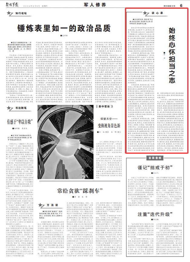 “士之为人,当理不避其难,临患忘利,遗生行义,视死如归。”对新时代革命军人而言,家国情怀是担当精神的重要来源,理想信念是担当精神的重要力量支撑,过硬本领是践行担当精神的重要底气。思想淬炼的深度决定担当力度,初心坚守的纯度决定担当成色,这种担当并非与生俱来,需要在不断强化理论武装中锻造忠诚品格,主动学习党的创新理论,始终把维护国家主权、安全、发展利益放在首位,坚定许党报国的赤子之心;需要在党性锤炼中夯实信念之基,时常反躬自省,打扫思想灰尘,坚定对马克思主义的信仰,对社会主义和共产主义的信念,在风浪考验中站稳立场、永葆本色;需要在备战打仗中锤炼胜战之能,立足本职精研业务,紧盯实战补齐短板,在练兵备战中精进素质,让过硬本领成为担当的坚实依托。广大官兵当以先贤先烈、英模典型为标杆,摒弃私心杂念、破除畏难情绪,把担当融入日常、落在战位、见于行动,在新时代新征程上勇挑重担、冲锋在前,以纯粹初心、坚定信念、过硬本领,向着如期实现建军一百年奋斗目标奋力攻坚。