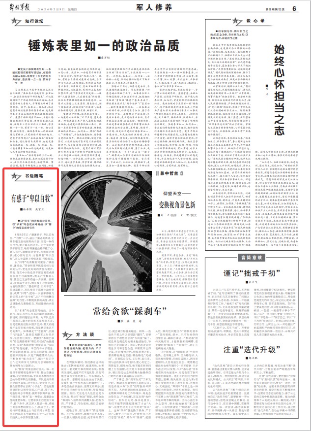 《周易》有云:“谦谦君子,卑以自牧也。”“自牧”二字,道出了谦逊的真谛:它并非毫无底线原则的示弱,而是一种向内用力、提升修养的功夫。对于军队党员干部而言,唯有将谦逊品格深植于心、融入言行,清醒面对荣誉,积极面对挑战,虚心面对官兵,方能做到“卑以自牧”,在人生道路上持续进取,行稳致远。