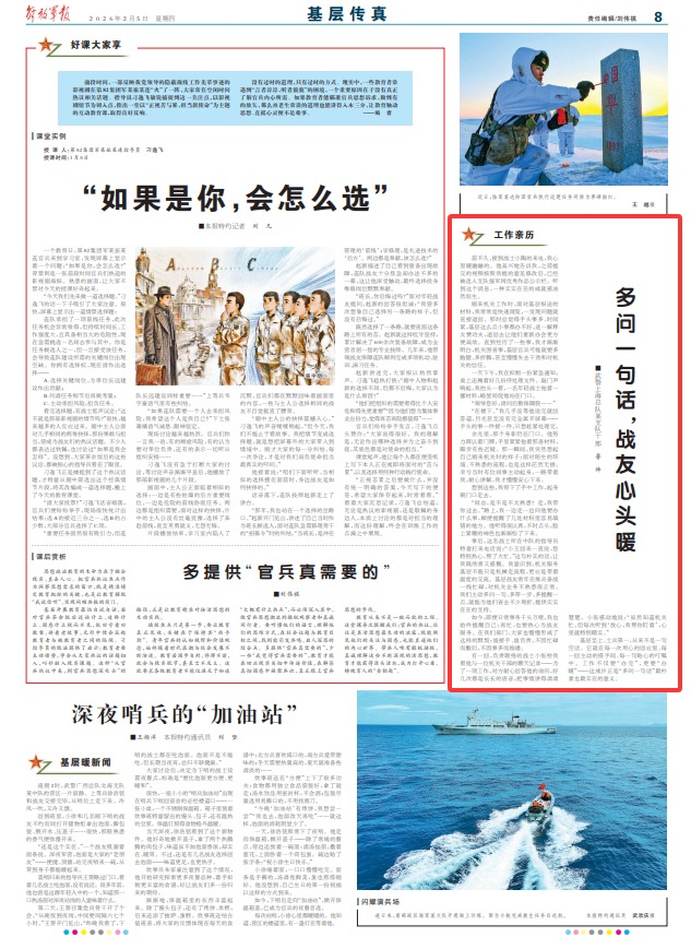 基层至上、士兵第一,从来不是一句空话。它就在每一次用心的回应里、每一回主动的搭手间、每一句贴心的叮嘱中。工作不仅要“办完”,更要“办暖”——这或许正是“多问一句话”最朴素也最实在的意义。