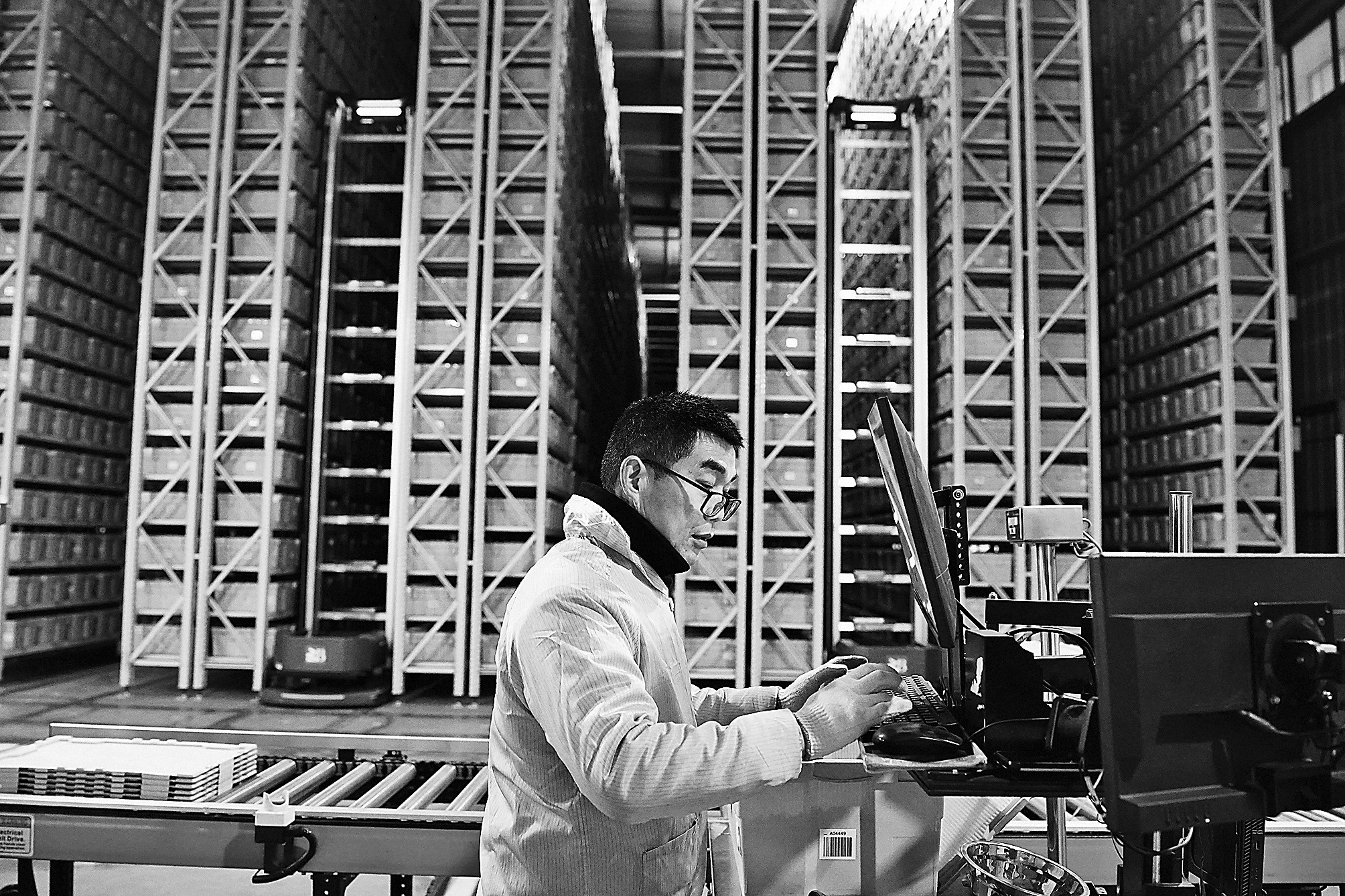 1月20日,在江西瑞金一家科技企业库房内,工作人员操作智能机器人抓取积木产品进行打包。新华社记者 周 密摄