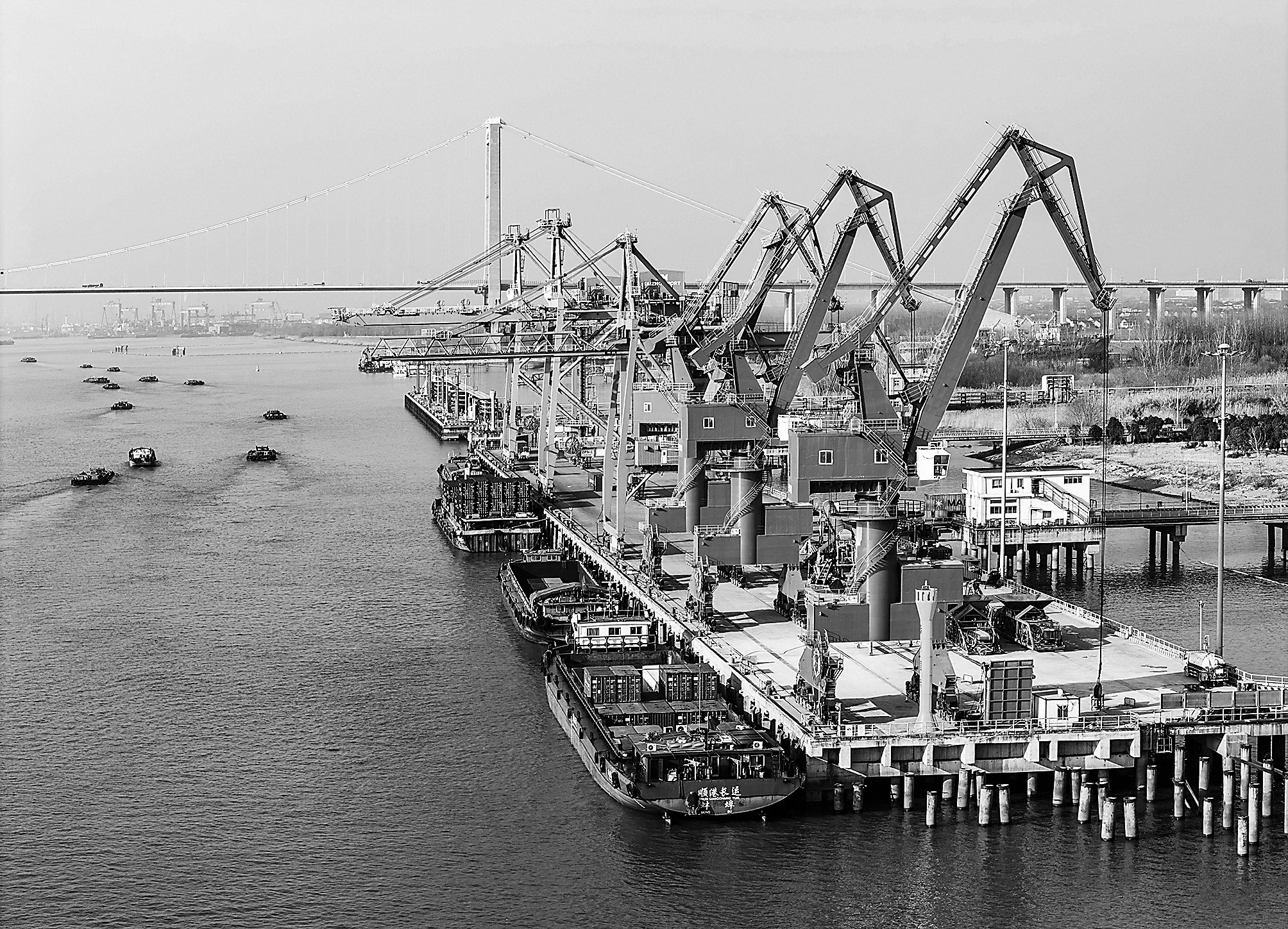 1月14日,江苏泰州港集装箱码头,货船停在泊位装卸货物。新华社发