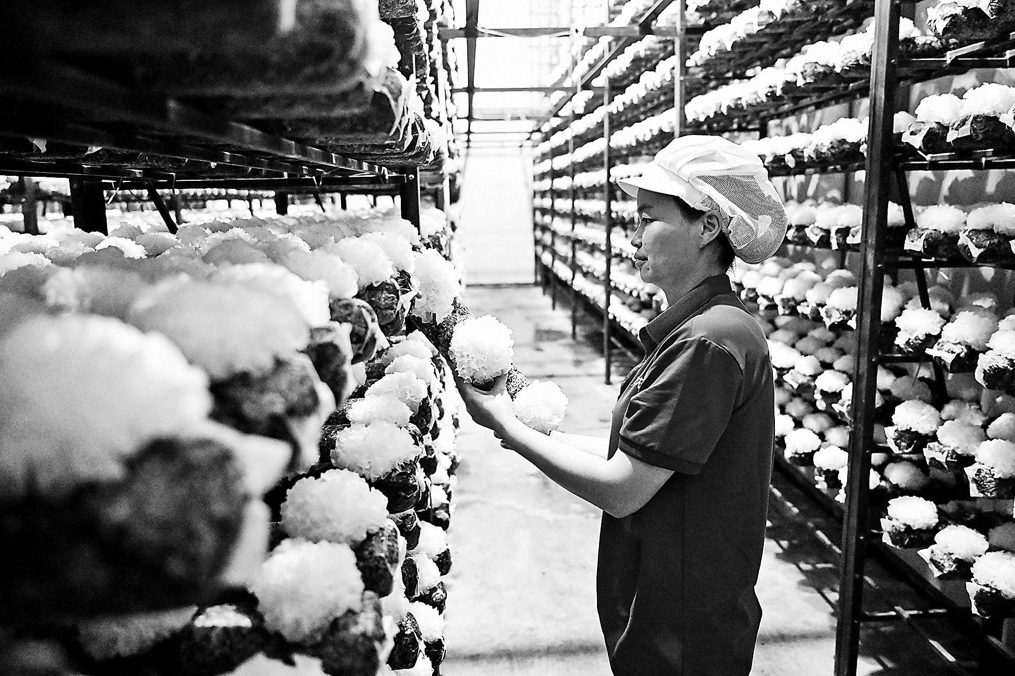 在福建宁德一家农业企业,工作人员查看银耳长势。新华社记者 林善传摄