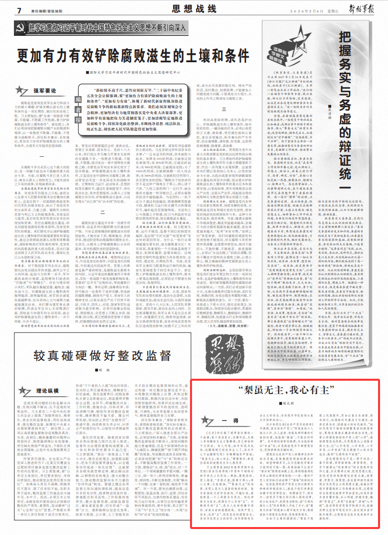 习主席曾在2022年春季学期中央党校(国家行政学院)中青年干部培训班开班式上引用这一典故,寓意深刻、发人深省。“自修之道,莫难于养心;养心之难,又在慎独。”“梨虽无主”的场景,本质上是无人监督的独处时刻。能否在独处之时守住底线、不越红线,最能彰显一个人的修为与定力。而这种修为与定力,则源自于心中有“主”。许衡眼中的“主”,是为人处世的操守准则、安身立命的道德底线。对共产党人而言,这份“主”,则是坚定的理想信念,是对马克思主义的信仰、对中国特色社会主义的信念、对实现中华民族伟大复兴中国梦的信心。