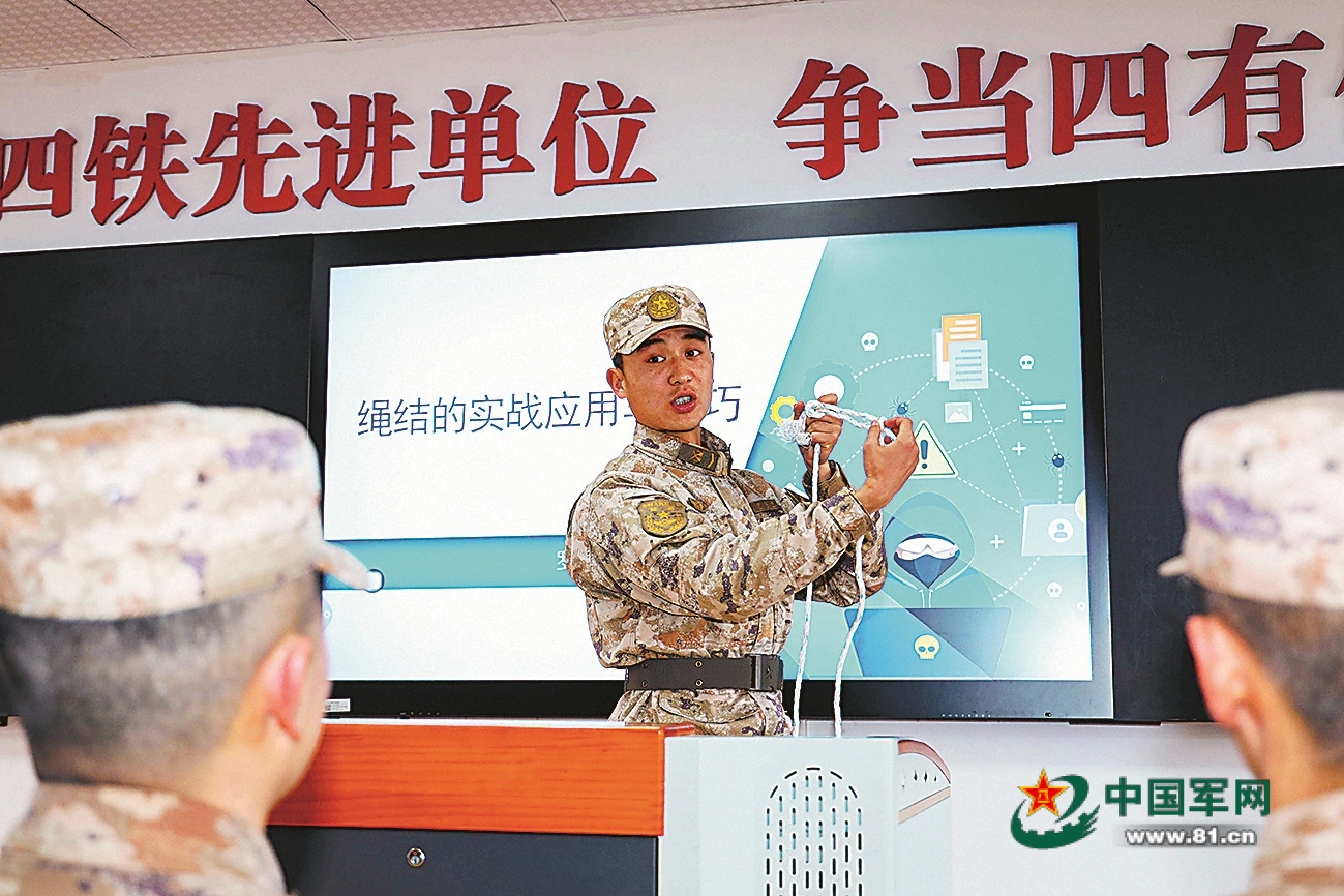 该连一名骨干正在讲授绳结的实战应用与技巧。于润伟 摄
