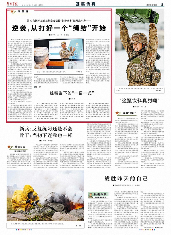 其中“奥妙”为何?该连杨连长翻开工作笔记本,抽出一张照片。只见画面中是一个绳结和几双粗糙的大手,照片背面写着“积少成多”4个大字。轻抚照片,杨连长感慨道:“取得今天的成绩,我们走了不少‘弯路’,但也收获了一条重要经验——提升战斗力,要从细节和基础抓起。”