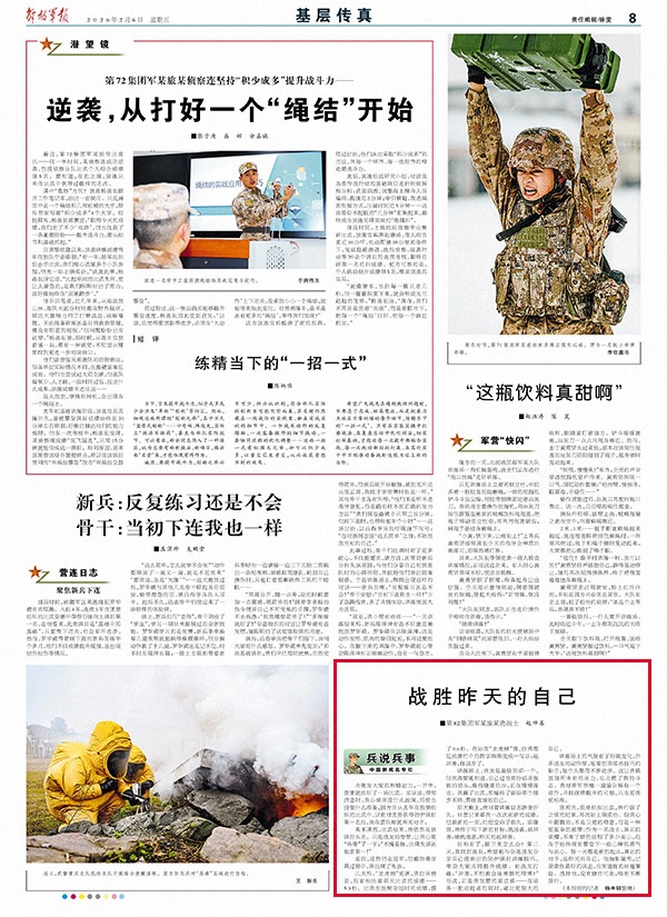 前两天,旅里组织比武,我打破了之前的纪录,再次站上领奖台。但我心中翻腾的,不是卫冕的得意,而是一种更复杂的感慨:作为一名战士,真正的荣耀,不在于曾经征服了多少高山,而在于始终葆有攀登下一座山峰的勇气与决心。每一天都是新的起点,真正的对手,是昨天的自己。他如影随形,记录着你最好的状态,也知道你的丝毫懈怠。战胜他,没有捷径可走,唯有不断前行。