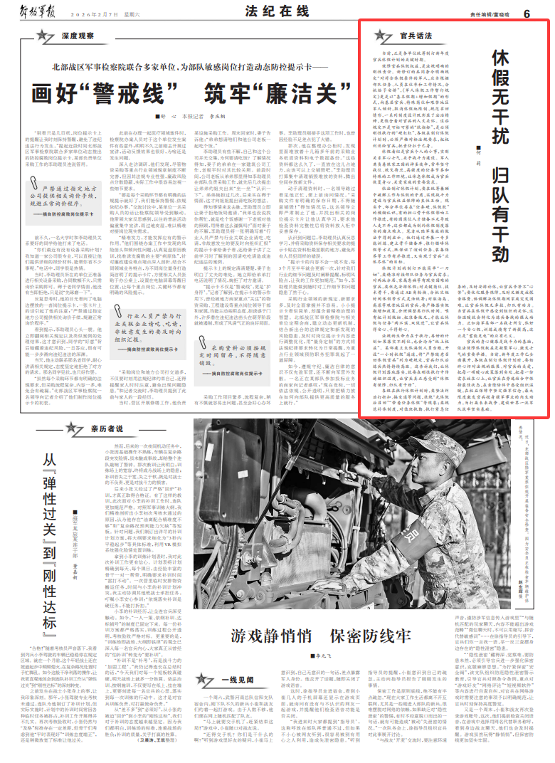 官兵的身心健康是战斗力的基础,依法保障休假权益是凝聚军心、激发士气的重要举措。当前,新年度工作已全面展开,各级在制订休假计划时,要始终心怀对法规的敬畏、对官兵的关爱,把每一项暖心政策落到实处,把每一份需求放在心上,让官兵在劳逸结合中保持最佳状态,在亲情陪伴中感受组织温暖,在权益保障中坚定强军信念,最大限度激发官兵投身强军事业的内生动力,为打赢未来战争、建设世界一流军队筑牢坚实基础。