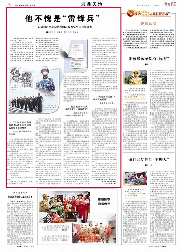在李超眼中,这段军旅经历,让金城龙更像一个“雷锋兵”。谈及金城龙参军前后的变化,李超感慨:“他当兵回来,参加公益活动更积极,一点儿也不计回报。”