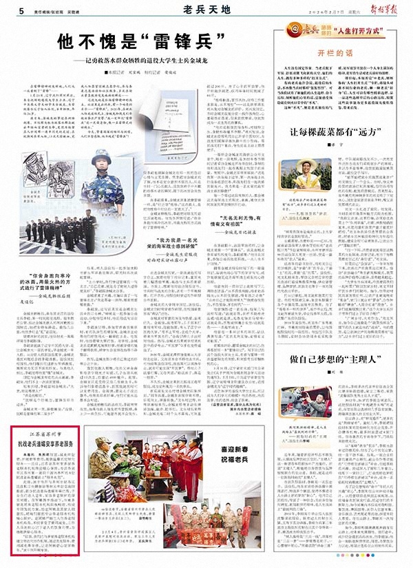 解放军报讯 朱熙君报道:减免床位费、护理费等费用,提供温馨的定制化服务……近日,江苏省苏州市多家养老服务机构推出暖心举措,为江苏省军区苏州第一离职干部休养所的5位抗战老兵遗孀送上“服务礼包”。