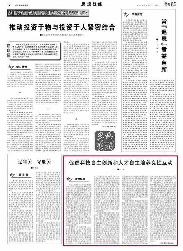党的二十届四中全会审议通过的《中共中央关于制定国民经济和社会发展第十五个五年规划的建议》,将“科技自立自强水平大幅提高”作为“十五五”时期经济社会发展的主要目标之一,强调要“一体推进教育科技人才发展。建立健全一体推进的协调机制,强化规划衔接、政策协同、资源统筹、评价联动,促进科技自主创新和人才自主培养良性互动”。新时代以来,在以习近平同志为核心的党中央坚强领导下,我国科技实力从量的积累迈向质的飞跃,走出了一条科技自主创新和人才自主培养融合发展道路。当前,实现科技自主创新和人才自主培养良性互动仍存在许多难点卡点堵点,我们必须坚持系统观念,加强科技与教育、人才统筹,进一步强化科技创新对教育和人才的牵引作用,推动二者从“低效叠加”向“高效反应”转变,为加快高水平科技自立自强提供坚实支撑。