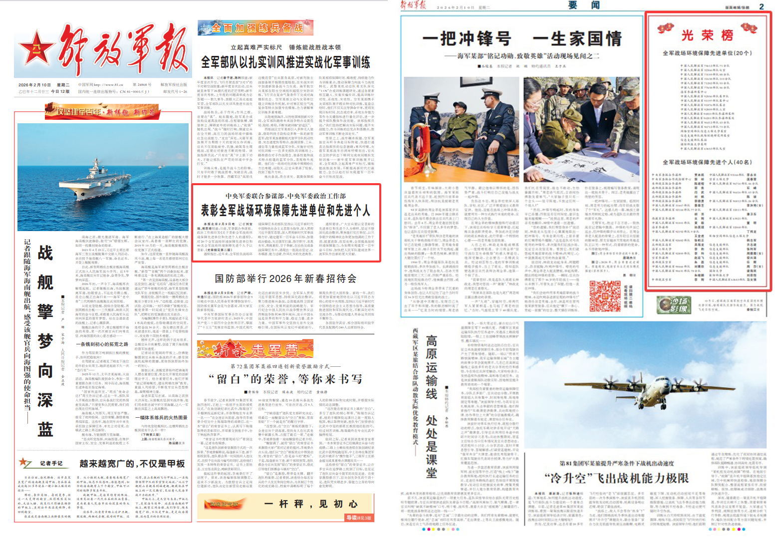 解放军报北京2月9日电 记者刘宝瑞、熊思琦报道:日前,军委联合参谋部、政治工作部印发《关于表彰全军战场环境保障先进单位和先进个人的通报》,对20个全军战场环境保障先进单位和40名全军战场环境保障先进个人予以表彰。
