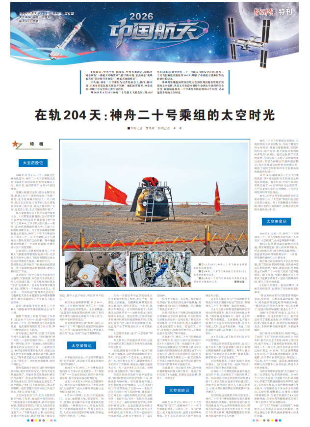 从2025年4月24日神舟二十号载人飞船发射,到2025年11月14日乘坐神舟二十一号载人飞船安全返回,神舟二十号飞行乘组在轨驻留204天,刷新了中国航天员乘组在轨驻留时长纪录。