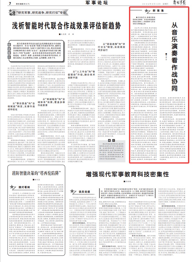 当战争的指挥艺术与音乐的演奏艺术相遇,我们得以窥见作战协同与音乐演奏有着惊人相通之处。音乐演奏的魅力在于和谐有序,现代作战的制胜之道在于流畅协同。从乐手的敏捷变奏到部队的灵活部署,从声部的跨域融合到作战的领域突破,从旋律的持续渲染到战场的持续压制,从演奏的多级联动到全域的多维打击,演奏艺术与指挥艺术在协同制胜的逻辑下实现了跨域共鸣。音乐演奏的艺术智慧,为破解现代作战协同难题、提升体系作战能力提供了全新的视角。
