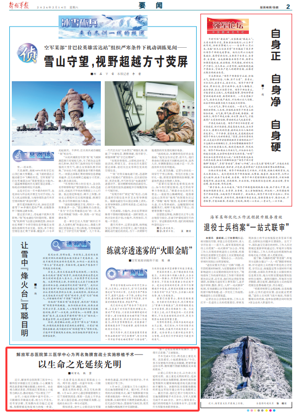 以爱心点亮生命之光,以生命之光延续光明。战士重见光明的背后,是该眼科医学部在角膜移植、眼神经损伤修复等眼科关键领域构建系统化救治链的不懈努力。该眼科医学部眼角膜组织库是全军较早建立的专业角膜库之一。截至目前,他们已累计为现役军人实施角膜移植手术百余台,为军人家属完成手术400余台。该中心领导表示,他们将持续提升为兵服务水平,忠实履行为军服务的职责使命。