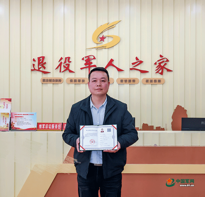 林佑雄手持退役军人事务员职业技能等级证书留影。郑银杰摄