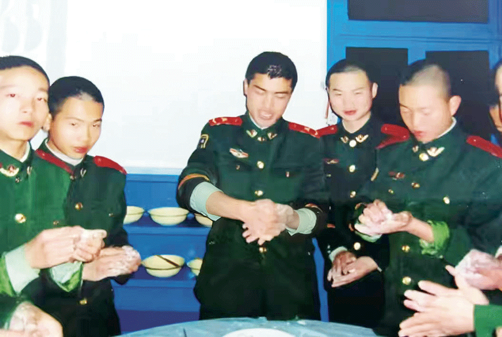 食堂的长条桌上,放着准备好的面团和馅料。随着大家手指翻飞,饺子很快装了大半个托盘。新兵安其勇是个南方小伙子,头一回包饺子,捏出的饺子总漏馅。我接过他手里的饺子皮,边演示边告诉他:放馅料要适量,捏褶时手上的劲要使匀,这样饺子才紧实耐煮。安其勇学得认真,虽然包出来的饺子还是有些“歪瓜裂枣”,但每一个都把馅料裹得严严实实。