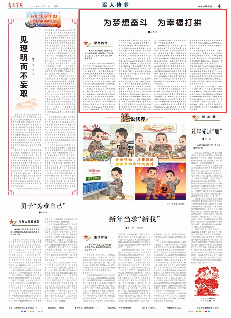 “山海寻梦,不觉其远;前路迢迢,阔步而行。”习主席在二〇二六年新年贺词中由衷致敬每一位辛勤付出的奋斗者,激励大家“一起为梦想奋斗、为幸福打拼,把宏伟愿景变成美好现实”。在“十五五”规划的开局之年,牢记习主席的勉励和嘱托,立足岗位知责奋进、担当奋斗,锚定目标努力拼搏、不懈攻坚,广大官兵就能以实干成就梦想,实现人生价值,收获人生幸福。