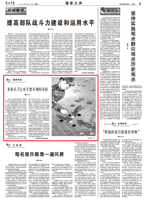 前不久,某军事科研机构以“掌握战场主动”为主题组织专家讨论。诸多共识中,“用奇招达成战争突然性”位列其中。这启示各级指挥员,赢得未来战争,必须睁大“灵魂的眼睛”,磨砺“思维利器”,超越对手的预判,发现一般人不易觉察的客观可能性,多备几手让对手想不到的奇招,牢牢掌握战场主动权,以最小代价赢得战场胜利。