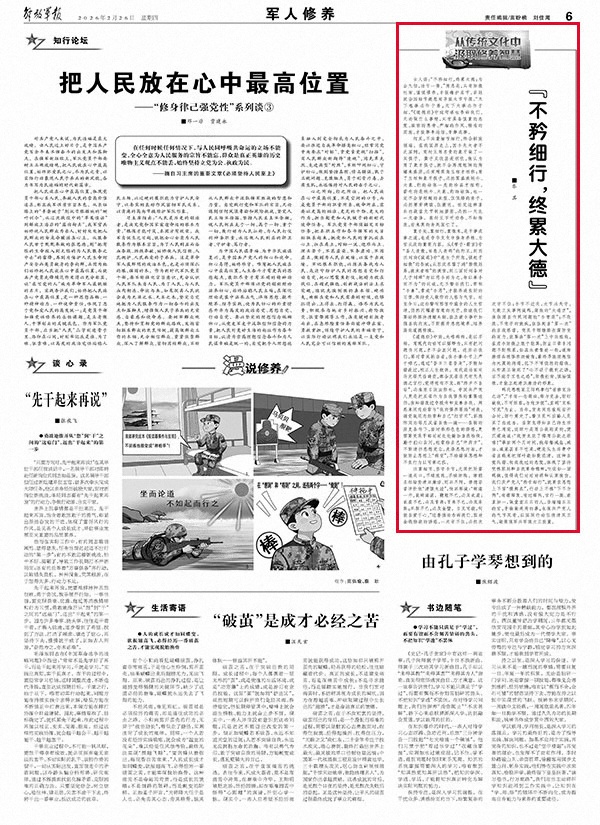 重小处、重细行、重微末,是干事成事之道,也是中华文化中修身养性、为官从政的重要内容。从《管子·霸言》中“圣人畏微,而愚人畏明”的灼见,到西汉刘向《说苑》中“患生于所忽,祸起于细微”的告诫;从东汉名儒丁鸿“禁微则易,救末者难”的谏言,到三国时刘备对儿子刘禅“勿以恶小而为之,勿以善小而不为”的训诫,无不警示我们,常积“小善”、常戒“小恶”,才能养成良好的习惯,保持受人敬仰的人格与气节。时至今日,这些警句格言中蕴含的人生哲理,仍然闪耀着智慧的光芒,启迪我们要始终保持清醒头脑,在点滴小事中加强自我约束,不断提升思想境界、培养高尚道德情操。