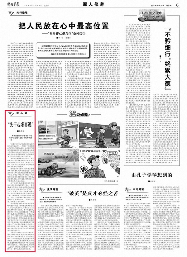 “只要方向对,先干起来再说!”在某单位干部任前谈话中,一名领导干部对即将赴任新岗位的同志如是说。这名领导干部担任过新组建单位主官,曾多次牵头完成大项任务,他以亲身经历鼓励大家,面对新岗位新挑战,年轻同志要有“先干起来再说”的行动力,争做行动派、当实干家。