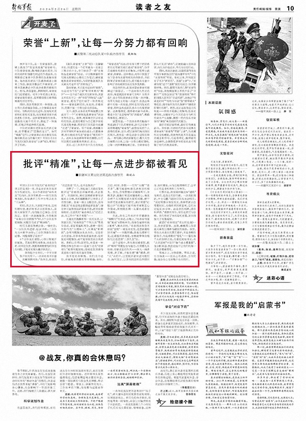 这个过程中,我也真切感受到,批评“精准”需要担当与能力,也需要扎实细致、实事求是的作风——深入一线多观察、多了解,才能在把“事”摆清、把“人”点明中,让受批评者知道问题何在、如何改正,让其他同志明白界限何在、如何避免,从而立起清晰明了、公平公正的是非标准和工作导向。