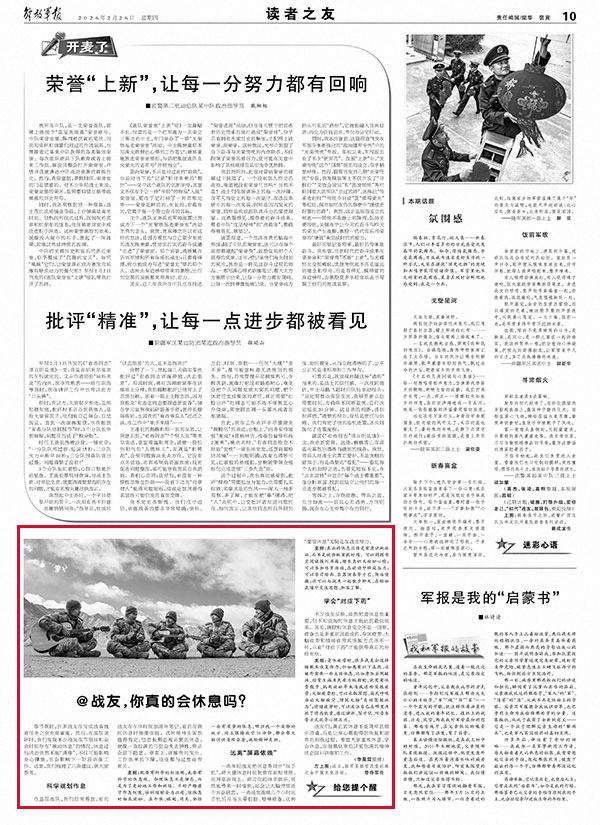 支招:真正的休息应该是有意识地放松,而不是被动地消耗时间。可以到图书室阅读报刊书籍,增长见识又放松心情;可以参加体育活动,在运动中释放压力;可以学习绘画、乐器演奏等才艺,陶冶情操;还可以与战友一起散步聊天,在轻松氛围中交流思想、加深了解。