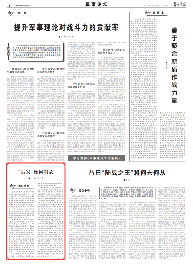 在传统战争中,“先发制人”常被视为夺取战场主动权的不二法门。然而,现代战争形态的深刻演变与制胜机理的日趋复杂,决定了战场主动权不再取决于谁先行动,而是取决于谁能够在复杂多变的战场环境中把握住关键节点、更高效地整合和运用资源、更快捷地塑造有利于己方的战场态势。从这个意义上讲,“后发”并非劣势,反而可能转变为一种优势。这要求我们在巩固自身防御能力的基础之上具备更强的战机发现能力和态势塑造能力,进而化被动为主动。