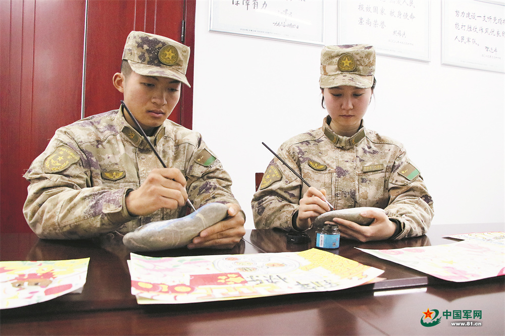 战士们为孩子描绘石头画。周佳辉摄