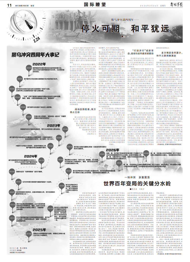 2月24日,俄乌冲突迎来四周年。战前,鲜有人预见到,乌军能在战场上与俄军形成对峙之势;也不曾想到,这场冲突持续时间会超过苏联卫国战争;更不曾想到,一次特别军事行动会成为改写俄乌两国命运、重塑欧洲安全格局、撬动大国关系重组的里程碑事件。