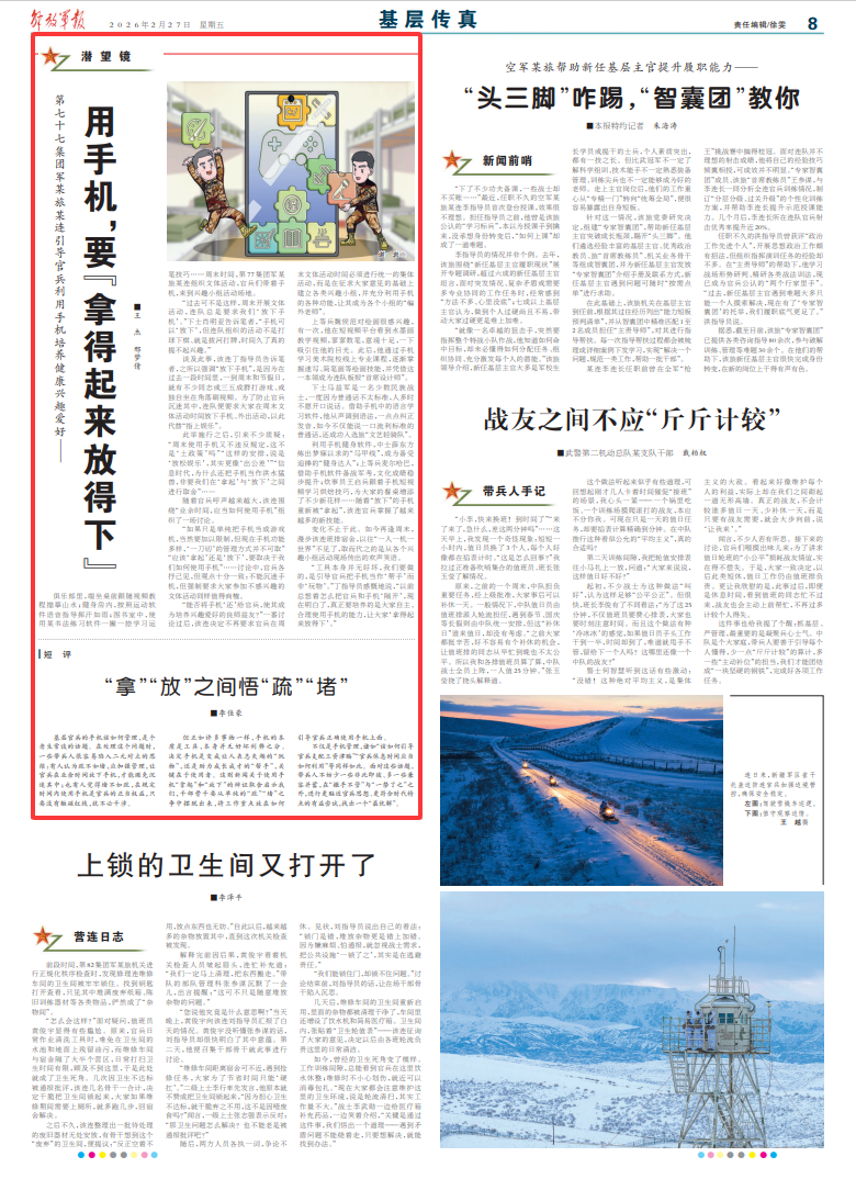但正如许多事物一样,手机的本质是工具,本身并无好坏利弊之分。决定手机是变成让人丧志失趣的“玩物”,还是助力成长成才的“帮手”,关键在于使用者。这则新闻关于使用手机“拿起”和“放下”的辩证取舍启示我们,干部骨干要从单纯的“疏”“堵”之争中摆脱出来,将工作重点放在如何引导官兵正确使用手机上面。