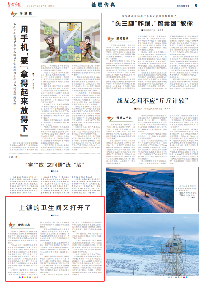 几天后,维修车间的卫生间重新启用,里面的杂物都被清理干净了,车间里还增设了饮水机和简易医疗箱。卫生间内,张贴着“卫生轮值表”——该连征询了大家的意见,决定以后由各班轮流负责这里的日常清洁。