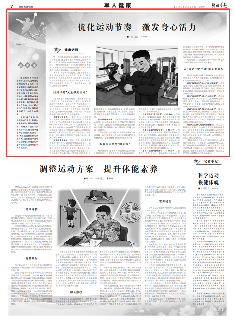 官兵的体能素质与身心健康不仅是个人战斗力的基础,更是部队整体作战能力的坚实保障。然而,有的战友对运动存在认识误区,可能因盲目加大训练强度而受伤;也可能因任务繁重、节奏紧张,难以保证运动锻炼的系统性和规律性,从而对身体健康产生负面影响。