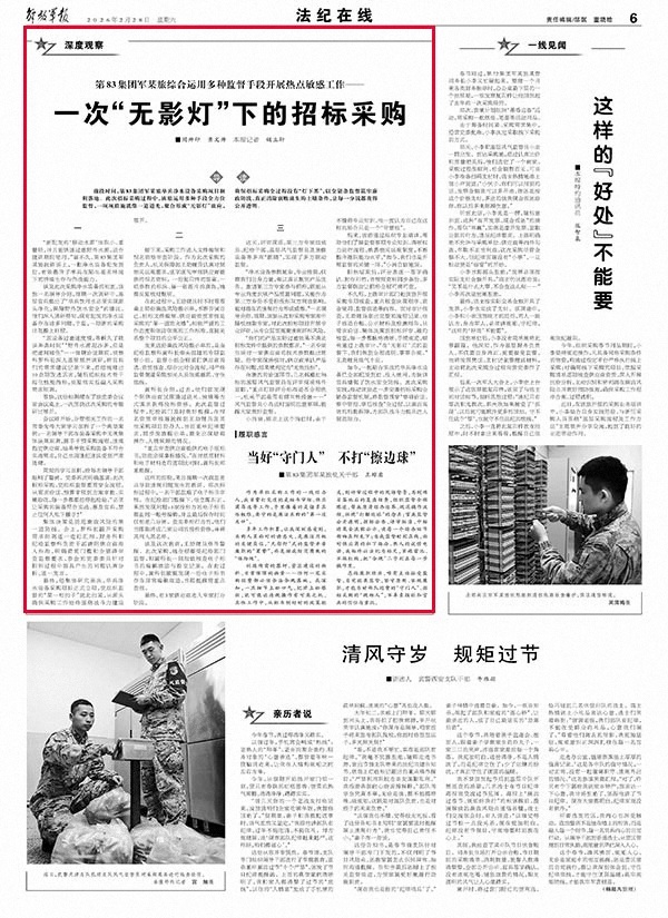 训练所需的器材、营区建设的物料、日常保障的物资……任何一笔采购经费都必须合法合规落地。我深知,一旦细节上松口气、纪律上松根弦,就可能让违规操作有可乘之机。具体工作中,从标书制订时的政策把关,到评审过程中的现场督导,再到项目落地后的复盘核查,组织监督全程跟进,帮我厘清经办边界、规范操作流程,杜绝“打擦边球”的念头;官兵监督公开透明,招标公告、评审标准、中标结果全流程公示,让每一个经办环节都晒在阳光下;自我监督时刻在线,面对供应商的私下接洽、熟人的说情电话,我始终以法纪为标尺,不越雷池、不踩红线,把“合规”二字刻在每一步操作里。