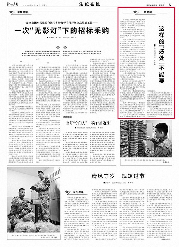 后来一次军人大会上,小李走上台展示了这张票据复印件,还原了与店主的对话细节,剖析思想过程:“违纪只有零次和无数次,那天我如果接受了‘返现’,以后就可能默许更多的回扣。守不住这个‘零’,也就守不住法纪的底线。”
