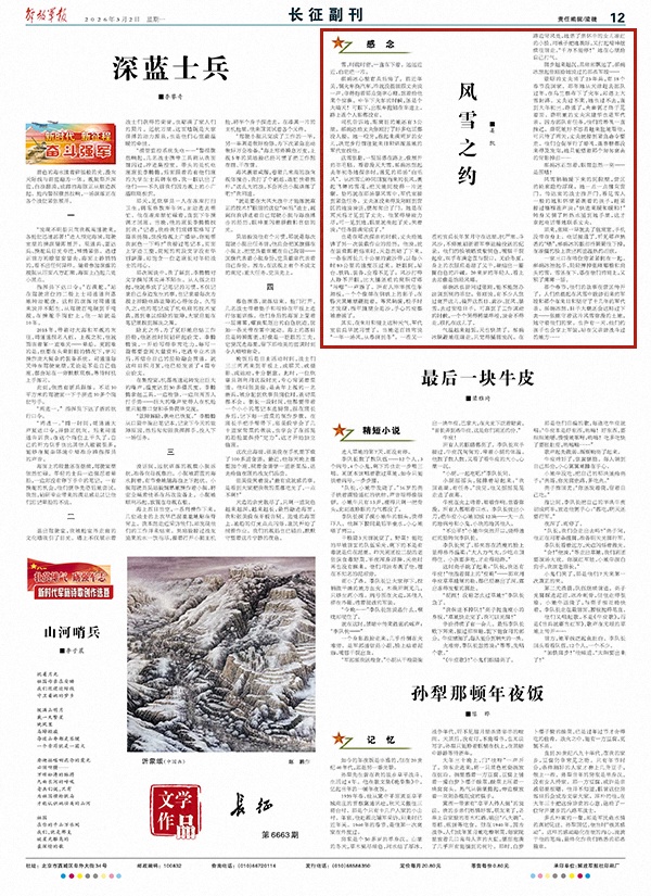 风雪稍稍缓下来的间隙里,营区的轮廓隐约浮现。她一点一点挪向营门。传达室的战士推开门,看见雪人一般的她和怀里紧裹着的孩子,赶紧接过襁褓连声说:“快进来暖和暖和!”转身又倒了杯热水递到她手里,这才拿起电话帮她联系丈夫。