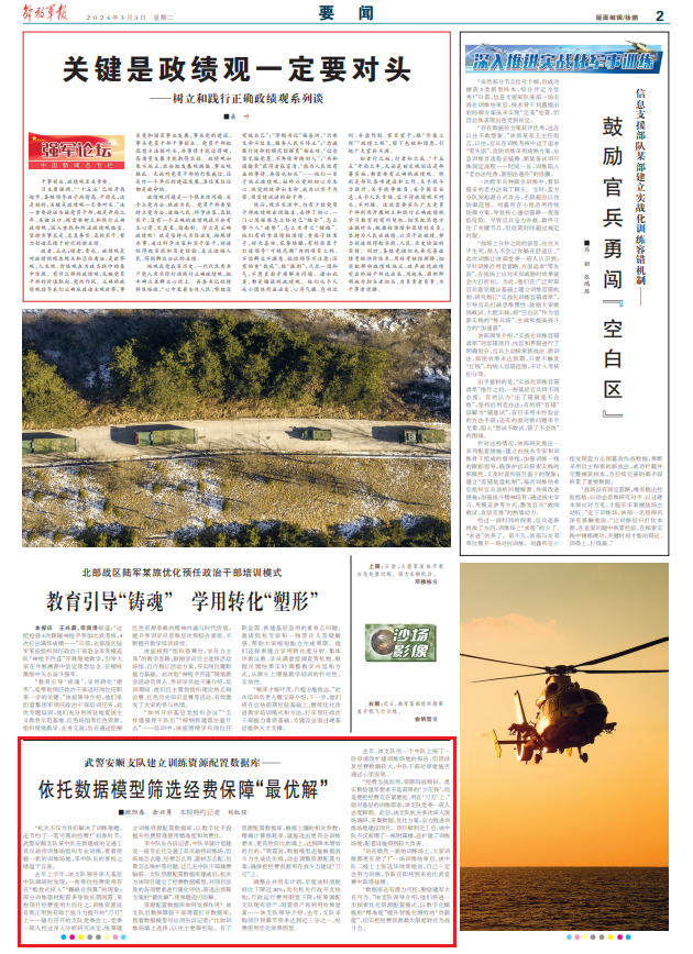 资源配置数据库如何发挥作用?该支队后勤保障股干部周震打开数据库,指着数据模型对应项告诉记者:“比如训练场填土选择,以往主要靠经验。有了资源配置数据库,根据土壤的相关参数,精确计算损耗率,就能选出更符合训练要求、更具性价比的填土,达到降本增效的目的。”周震说,数据模型还能根据战斗力生成优先级,动态调整资源配置方案,确保把经费资源用在战斗力建设“刀刃”上。
