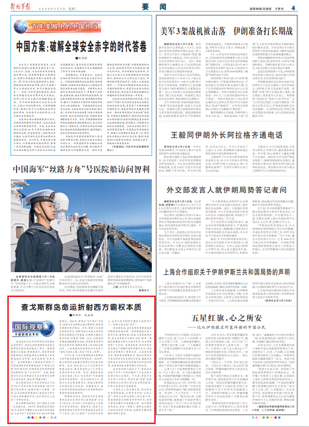从殖民主义的血腥交易,到对原住民的强制驱离;从附加条件的“主权让渡”,到在主权移交进程上的反复无常,英美围绕查戈斯群岛的种种行径,将西方国家的霸权本质暴露无遗。查戈斯群岛的命运,犹如一面镜子,映照出去殖民化进程的曲折与艰难,也映照出霸权逻辑的顽固与虚伪。