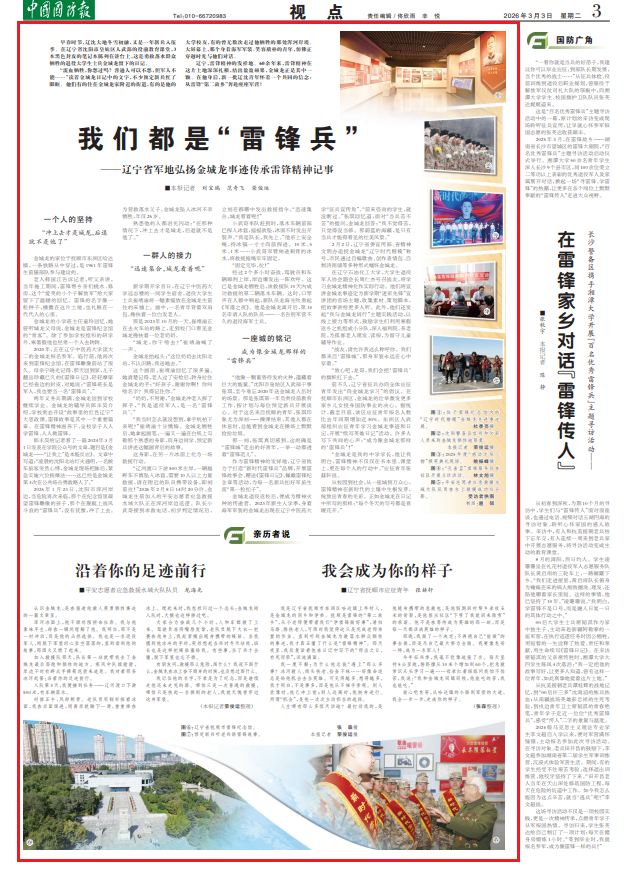 我是辽宁省抚顺市东洲区哈达镇上年村人,是金城龙的同乡和学弟。抚顺是雷锋的“第二故乡”,从小老师便带着我们“学雷锋做好事”,清扫马路、搀扶老人,可那时我觉得这只是完成老师布置的作业。直到听到金城龙为救落水群众牺牲的事迹,我才真正懂了什么是“雷锋精神”。那天夜里,我反复读着他在日记中写下的“师出之日,有死而荣”,泪流满面。