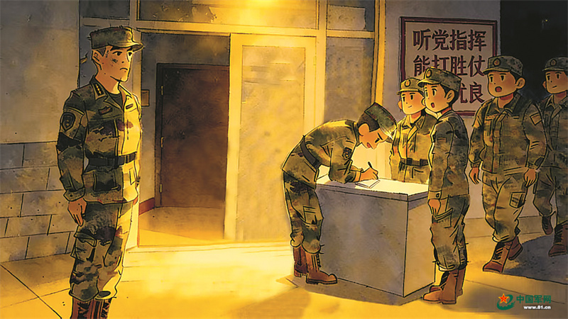 中士植可泳透过食堂的窗户往外瞧。灯光照在指导员身上,那个挺拔坚定的身影,让他鼻头一酸:“指导员真贴心!”