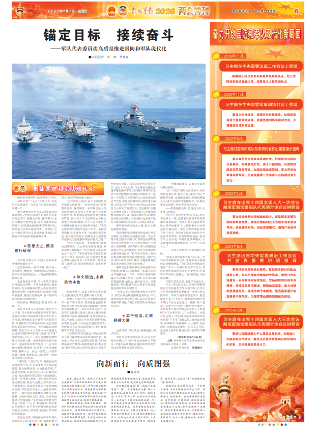 面对重要的历史节点,肩负如山的使命责任,参加全国两会的军队代表委员坚定表示,要锚定目标、接续奋斗,在浴火锻造中更加坚强,在担当使命中砥砺前行,高质量推进国防和军队现代化,加快把人民军队建成世界一流军队,为以中国式现代化全面推进强国建设、民族复兴伟业提供坚强战略支撑。