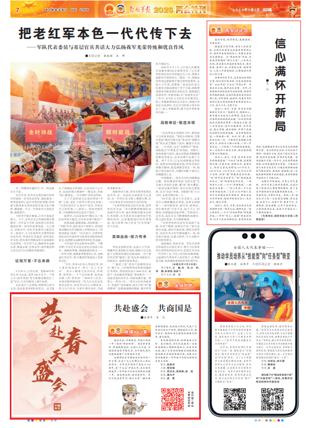 全国两会是中国政治生活中的一件大事,也是广大人民群众关心热议的焦点。今年是中国共产党成立105周年,是“十五五”开局之年,是打好实现建军一百年奋斗目标攻坚战的关键一年。奋进新征程,建功新时代。军队代表委员牢记“国之大者”,锚定推进强国建设、民族复兴伟业,代表广大官兵行使庄严使命,围绕政府工作、国计民生、国防和军队建设积极履行职责、建言献策。