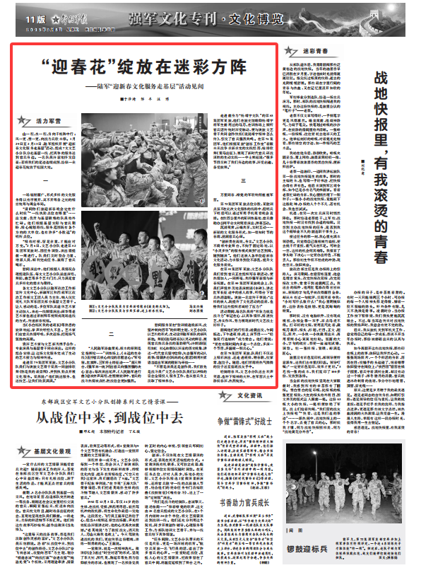 在第81集团军某旅,文艺小分队队员们看到官兵正在组织写春联活动,便热情加入、一同挥毫,共抒强军豪情与新春祝愿。在第80集团军某旅晚会上,队员们声情并茂地表演朗诵《丰碑》,讲述红军长征途中的感人故事,听得台下官兵热泪盈眶。该旅一名宣传干事说:“这样的嵌入,既提升了文化活动的品质,也给我们这些组织者减轻了压力!”