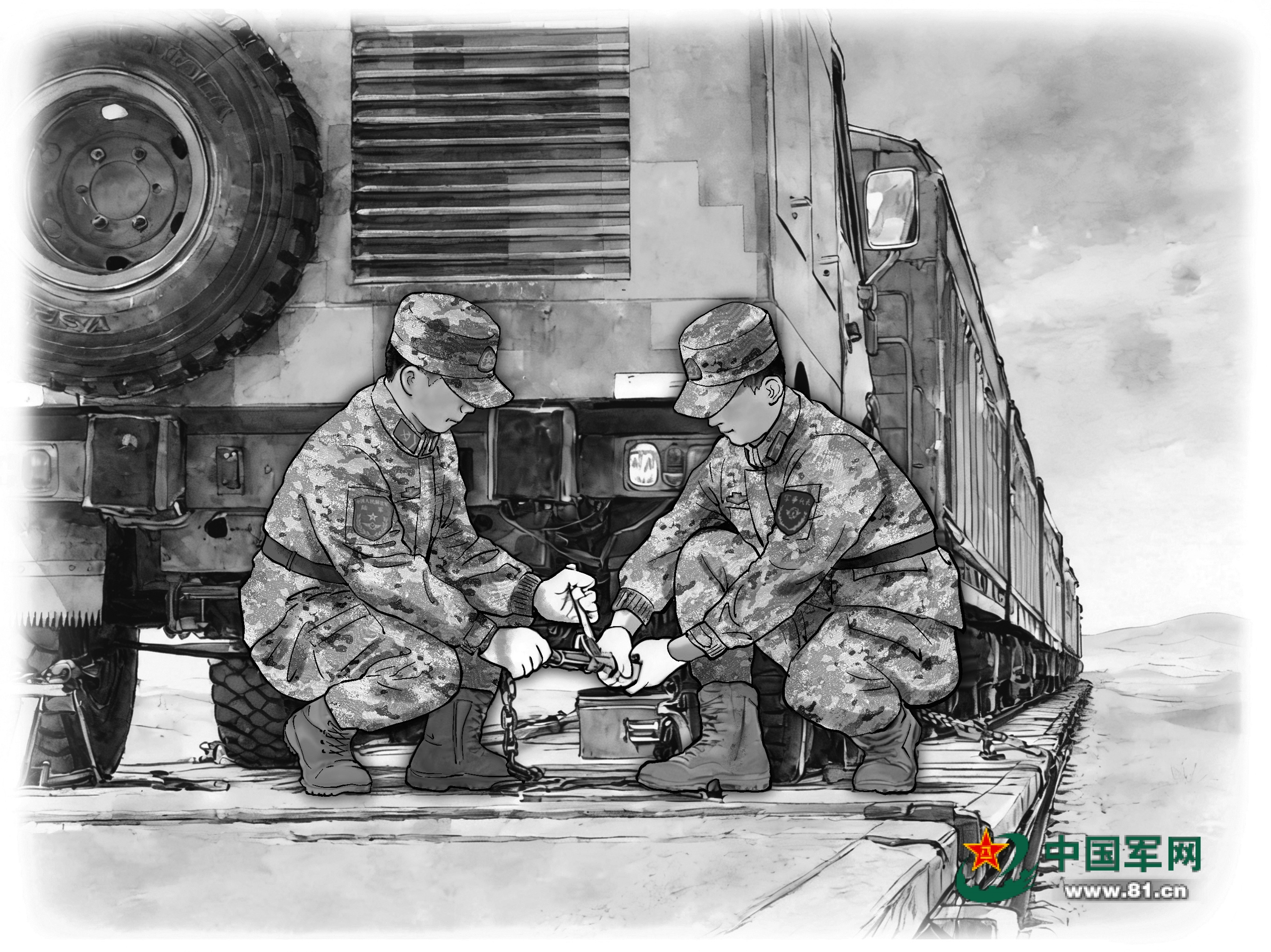 铁路线的一端连着五彩斑斓的外界,另一端则通往金属光泽浓郁的演训场。无论什么季节,白天黑夜,前来演训的军列都要先停靠在这一端的铁路站台上。随着制动开启,军列逐渐停稳,卸载也就开始了。站台上下,紧固器链条解绑装备的嘎吱声、装备开下站台时的轰隆声,官兵背着行囊跑下军列的脚步声此起彼伏,好不热闹。而茫茫荒野中的这点热闹,必定和一个小集体有关。他们戴着写有“军事代表”4个字的红臂章,在这条荒漠铁路线的边缘,保障着军列到达和发出。