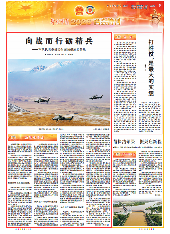 军人生来为打仗。“扎实推进练兵备战,加快先进战斗力建设”,政府工作报告中的这句话引起军队代表委员的强烈共鸣。今年是“十五五”开局之年,也是攻坚建军百年的关键之年。站在强军兴军的重要历史当口,唯有深入推进政治整训,坚持为战而整、以整促战,始终锚定能打仗、打胜仗这一核心目标,以体系融合凝聚胜战合力,以科技创新催生新质战力,以枕戈待旦保持临战状态,方能在新时代新征程上持续锻造敢打必胜、能战善战、随时能战的精兵劲旅,打好实现建军一百年奋斗目标攻坚战。