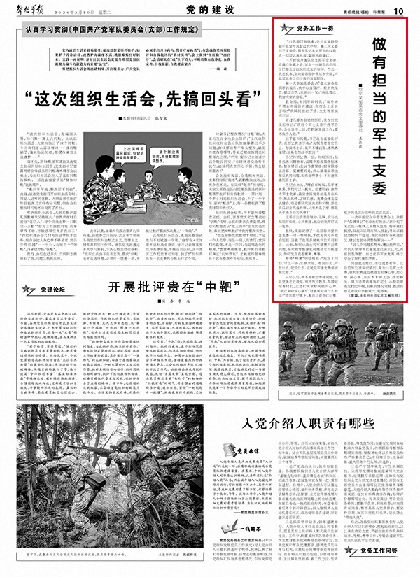 岗位就是责任,在位就要有为。这段经历让我深切感到,身为一名军士支委,我的职责就是把战友的操心事、烦心事、揪心事,原原本本带上会、推动解决。脚下沾着训练场的泥土,心里装着战友们的冷暖,反映的情况问题、提出的意见建议自然接地气、能落地。